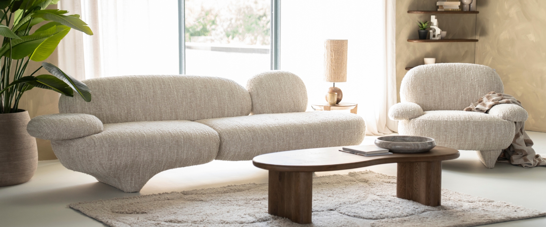 Wil je je interieur een serene Japandi uitstraling geven? Start met een basis van zachte, neutrale kleuren en natuurlijke materialen. In de woonkamer creëer je rust en balans met een bank met organische vormen, een houten tv-meubel en een minimalistische salontafel. Maak het geheel compleet met een Japandi vloerkleed en een keramieken vaas voor een subtiele, stijlvolle finishing touch.