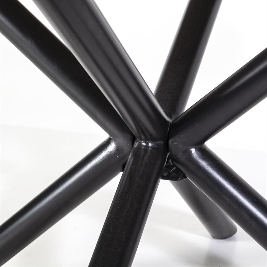 Het tafelblad, vervaardigd uit hoogwaardig mangohout, straalt warmte en karakter uit. De kruispoot, gemaakt van metaal, voegt een modern en industrieel element toe aan het ontwerp, waardoor de tafel een echte eyecatcher wordt in je interieur.