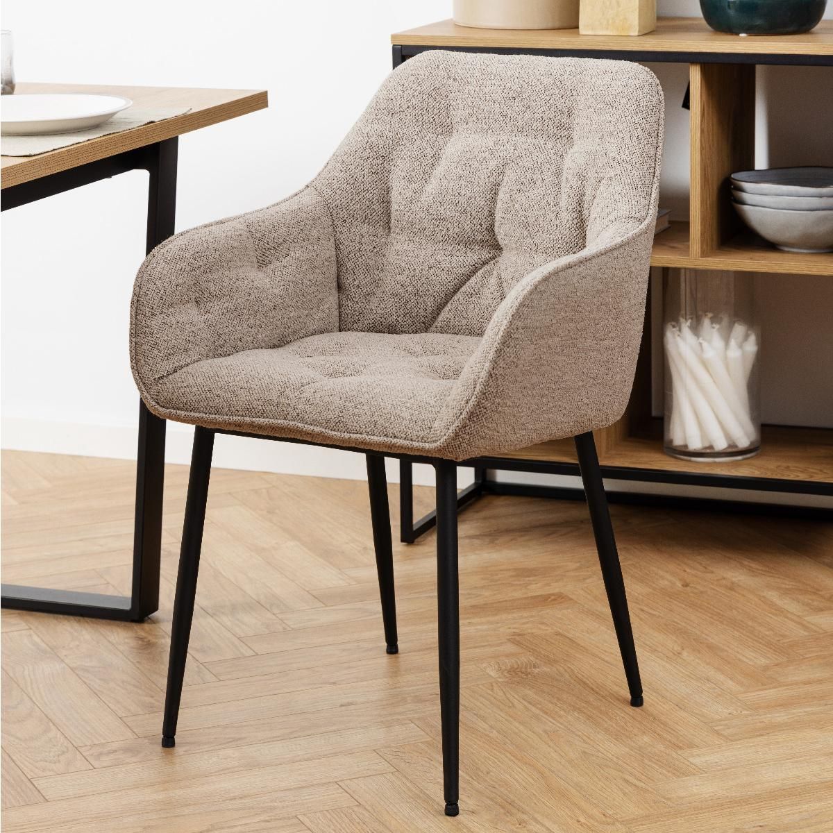 De Kari armstoel combineert strak, modern design met comfortabel zitten. Het zwarte metalen onderstel geeft de stoel een stoere en eigentijdse uitstraling, terwijl de zitting bekleed is met Monza-stof, verkrijgbaar in beige, grijs, antraciet, taupe of de standaard uitvoering. Dankzij de ergonomische armleuningen en het zachte, duurzame materiaal is de Kari perfect voor lange diners of gezellige gesprekken. Het tijdloze design past moeiteloos in zowel moderne als klassieke interieurs.