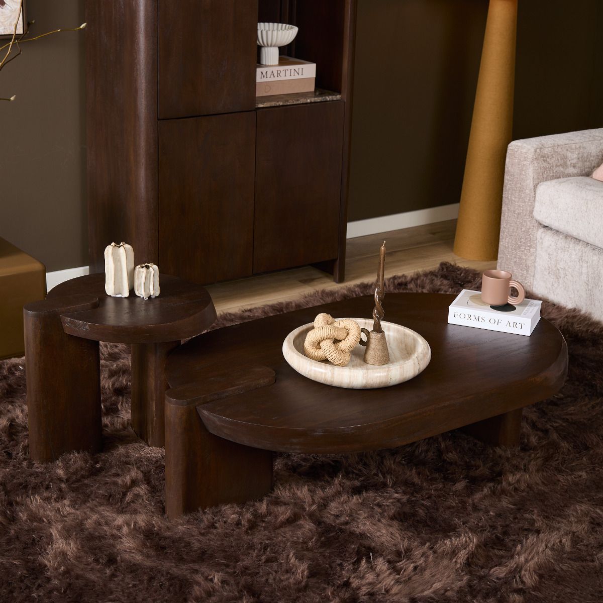 Salontafel Rava is gemaakt van mangohout in de kleur bruin. Het ronde blad rust op twee brede poten die zorgen voor een stabiele basis. De tafel heeft een laag en stevig ontwerp dat praktisch is voor gebruik in de zithoek.
